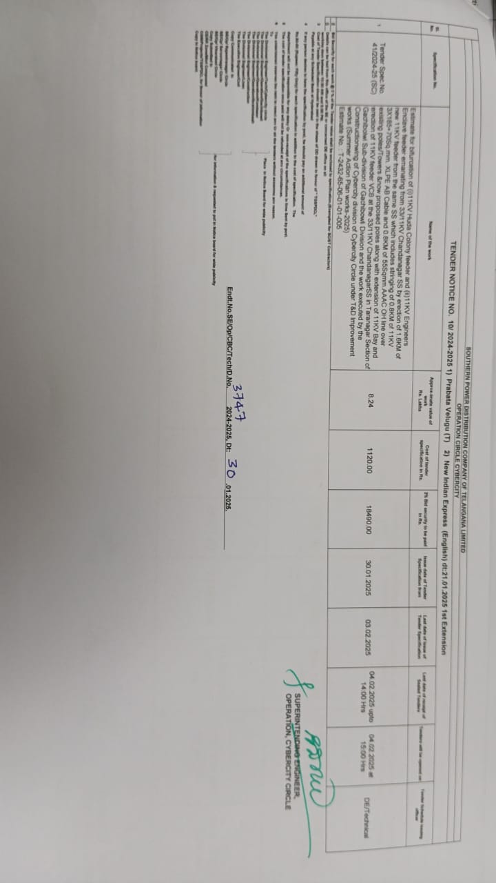 TENDER NOTIFICATION NO. 16/25-26 Superintending Engineer, Operation Rajendranagar Circle. |