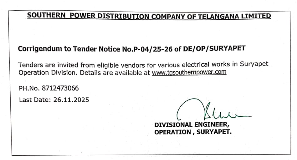 Open Tender Notification No. 07/25-26 Tender Specification No.G-19 /25-26(SC Reserved) Superintending Engineer/Operation/Nalgonda. |