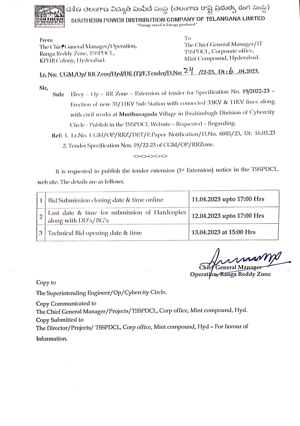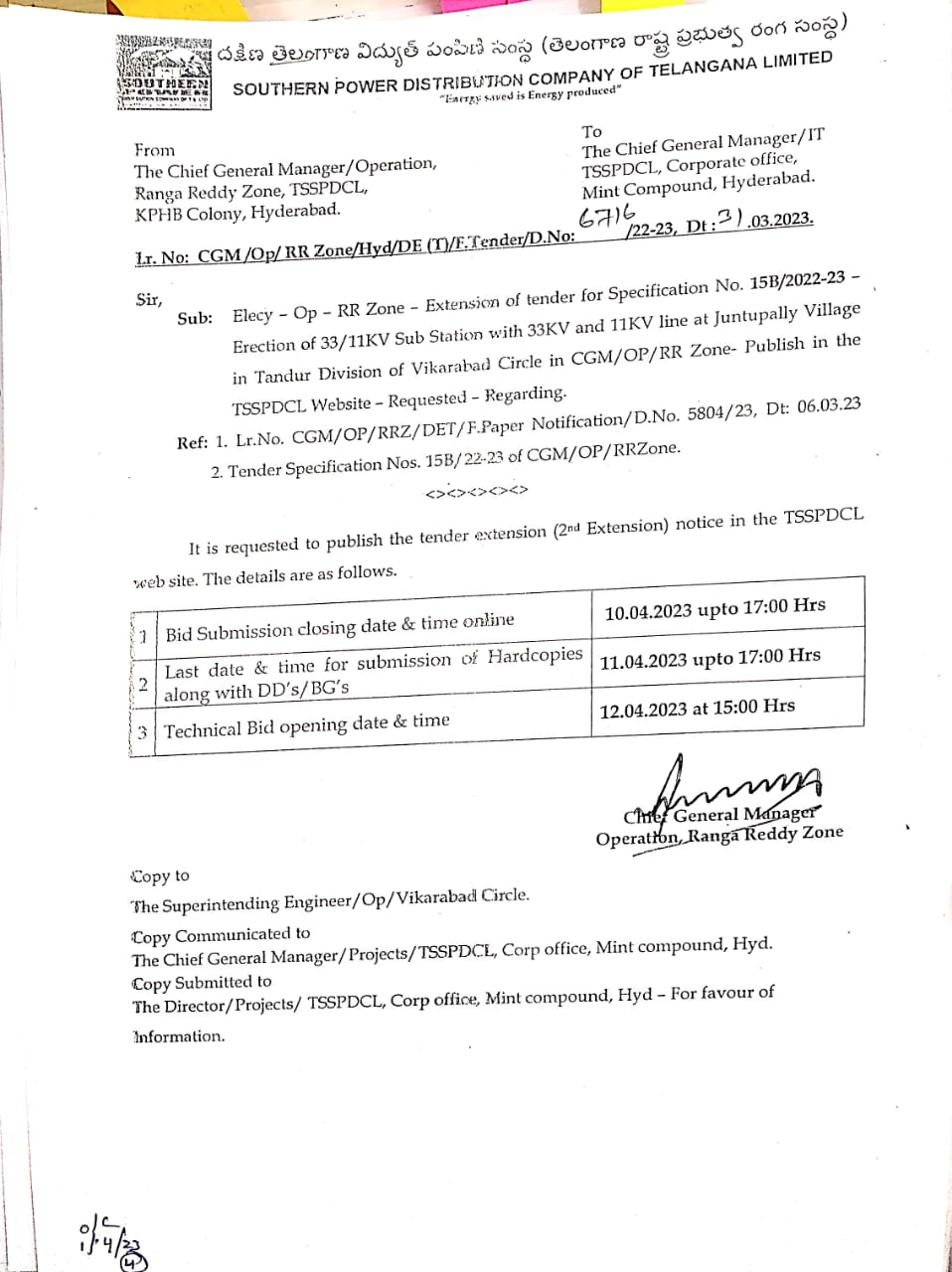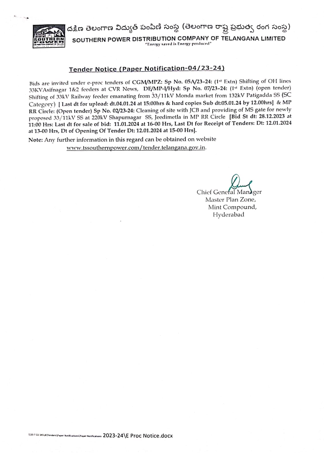 BID No.Chief General Manager/Master Plan /GH/TSSPDCL:01/2023-24. Chief General ManagerMaster Plan Zone, Mint Compound,Hyderabad |