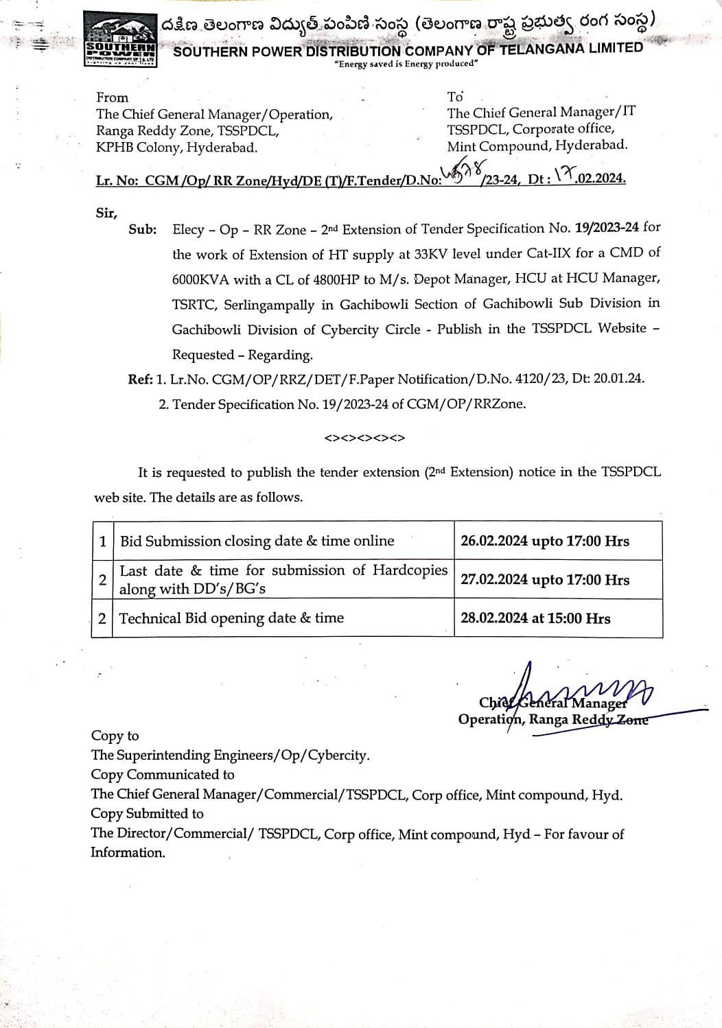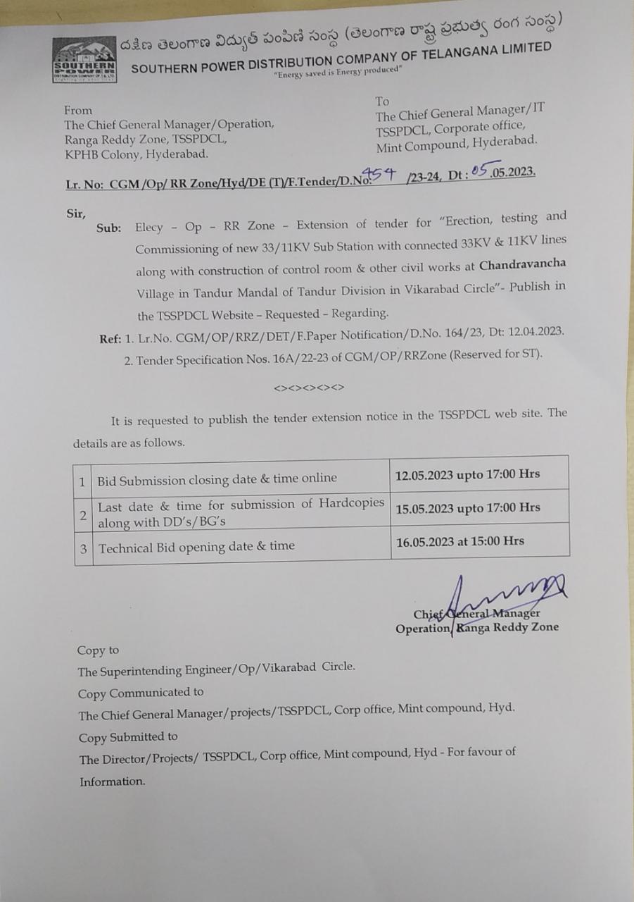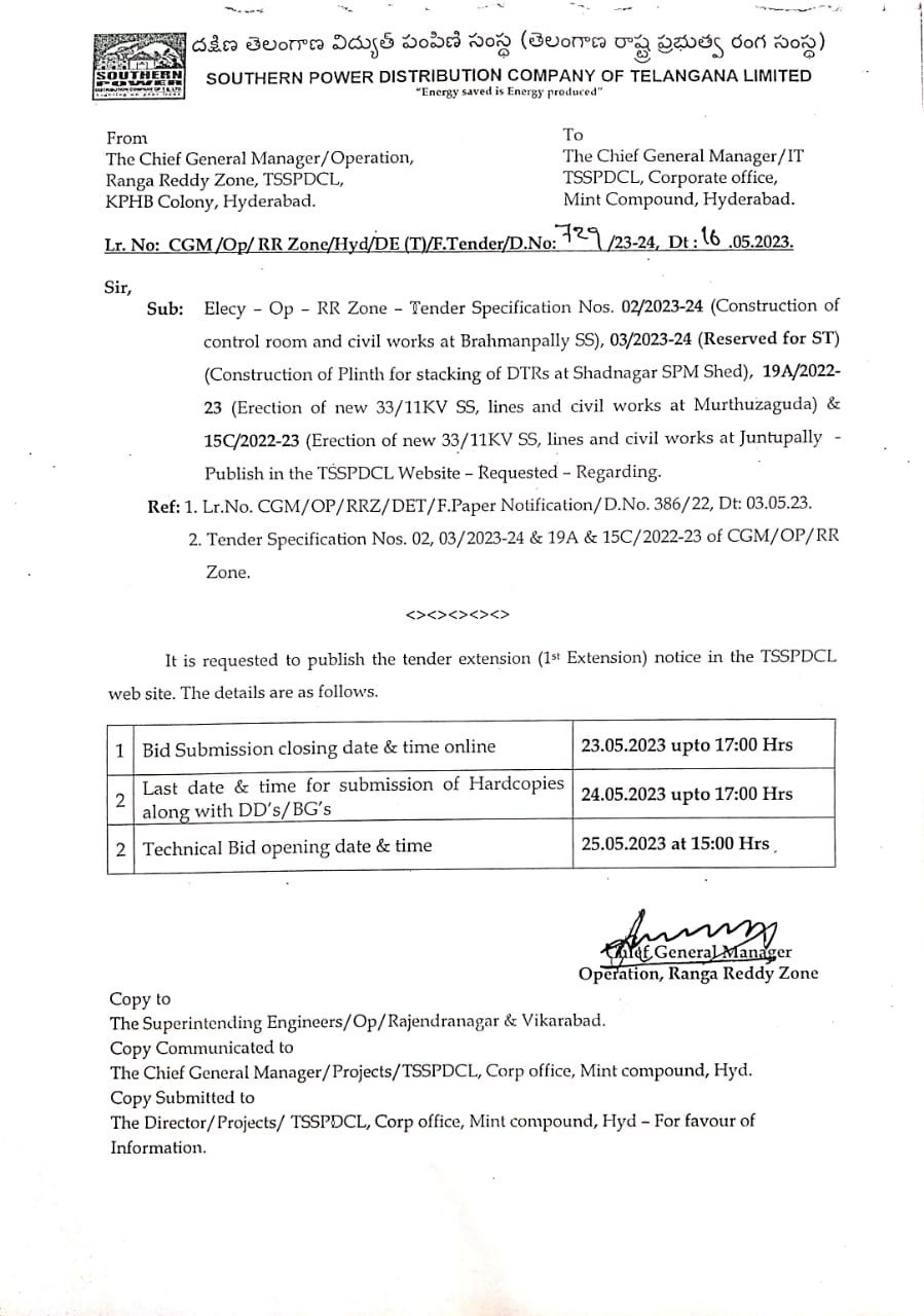 E-Procurement Tender Notice.01/2023-24. Tender Specification No:01 02/2023-24 1st extension extension of specification No.17/2022-23 Chief General Manager Operation, Rural Zone,TSSPDCL,Gagan Vihar, Nampally, Hyd.