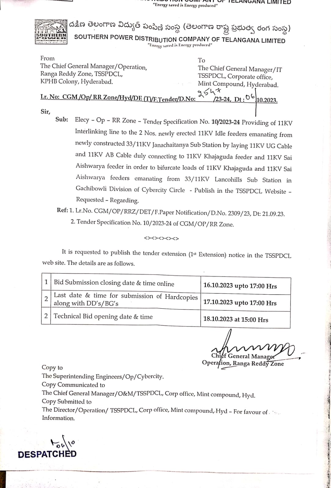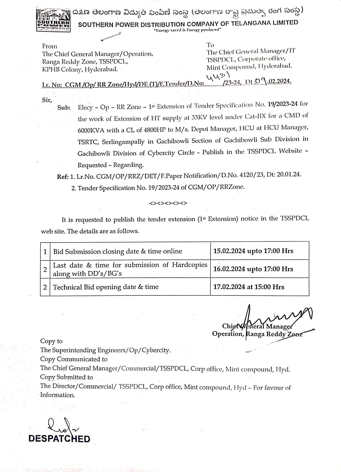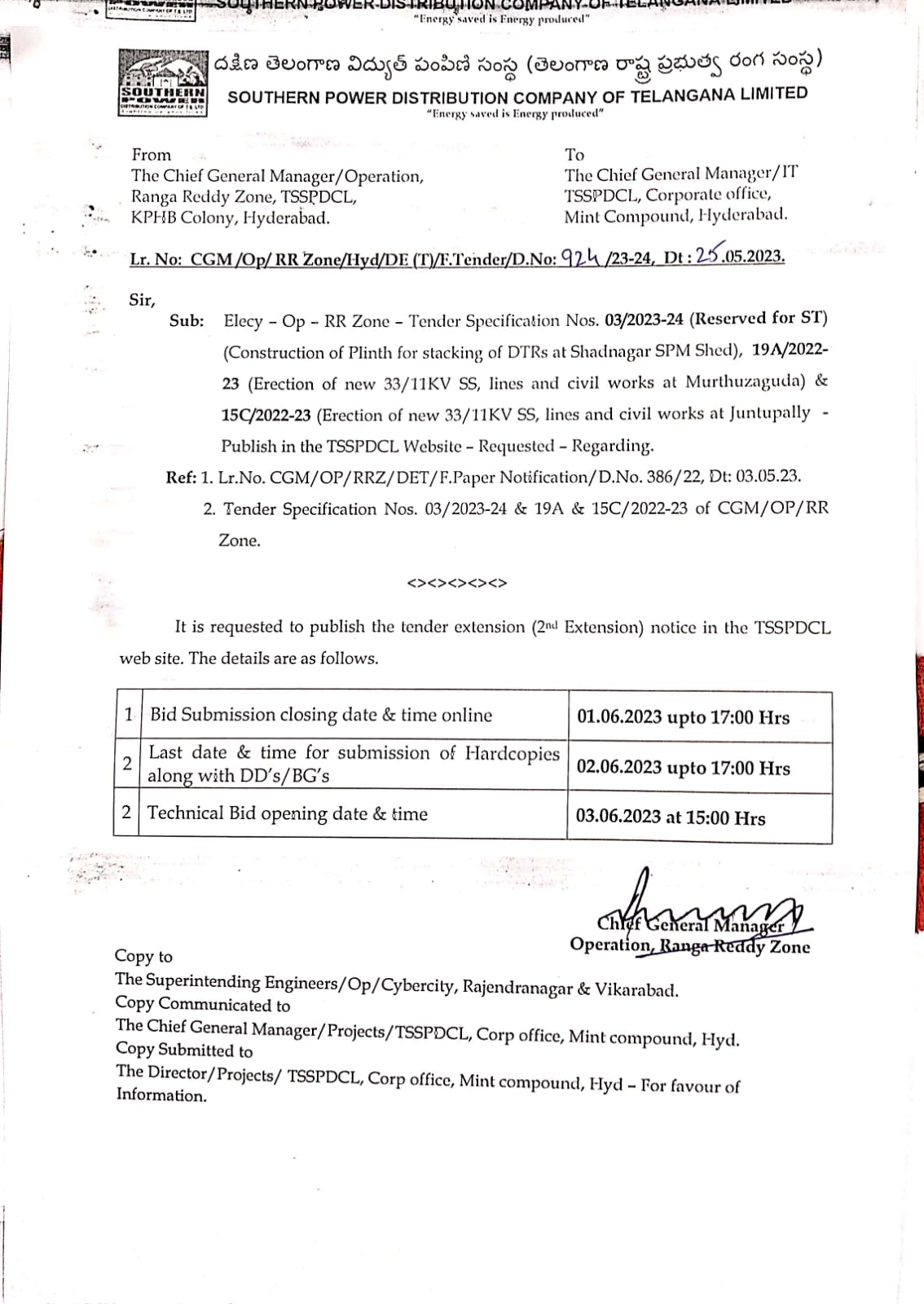 Tender Specification No.CGM/OP/RR Zone- 01 02 03 15C 19A /2023-24 Chief General Manager Ranga Reddy Zone, TSSPDCL,KPHB Colony, Hyderabad