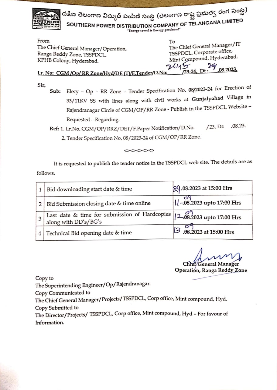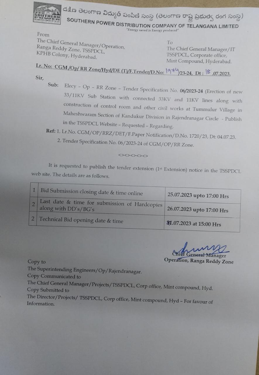 Tender Specification No.CGM/OP/RR Zone-20 21/2022-23 Chief General Manager Ranga Reddy Zone, TSSPDCL, KPHB Colony, Hyderabad. |