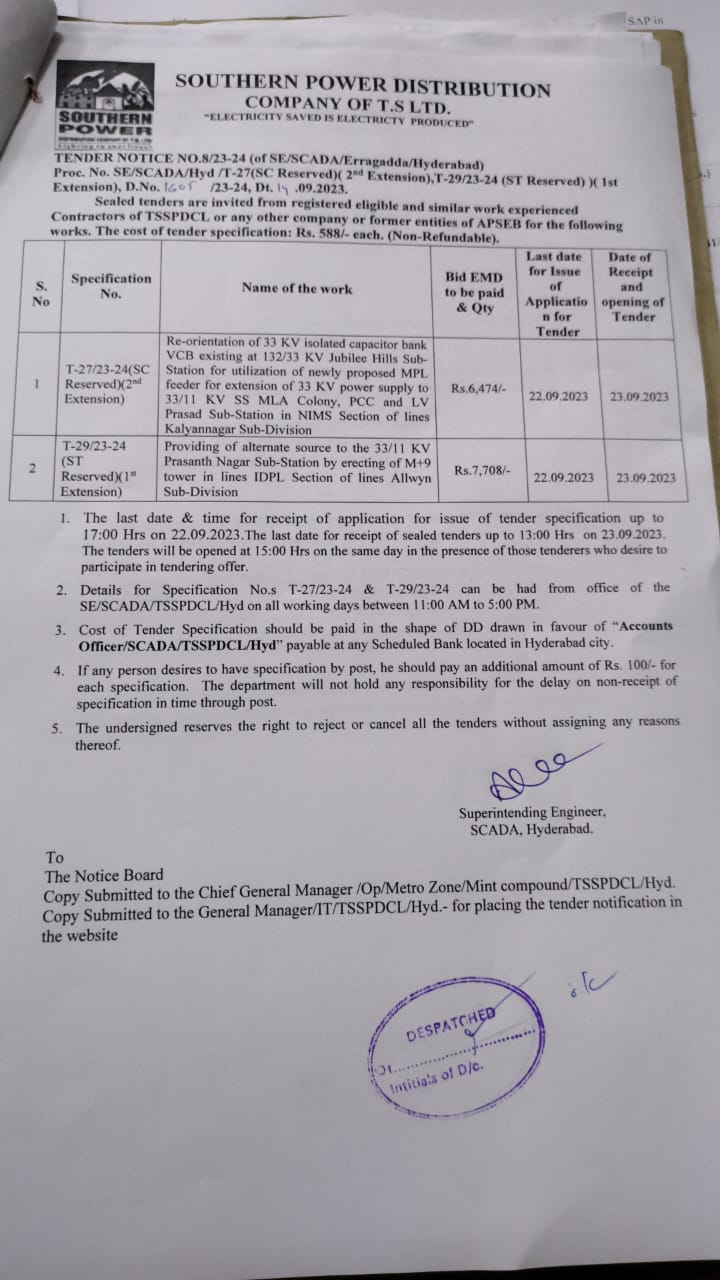 Tender Notice No.01/23-24 Tender Specification Nos.01 02/2023-24 of SE/ Civil/ Corporate Office/TSSPDCL Superintending Engineer/Civil Corporate Office, TSSPDCL, Mint Compound, Hyderabad. |