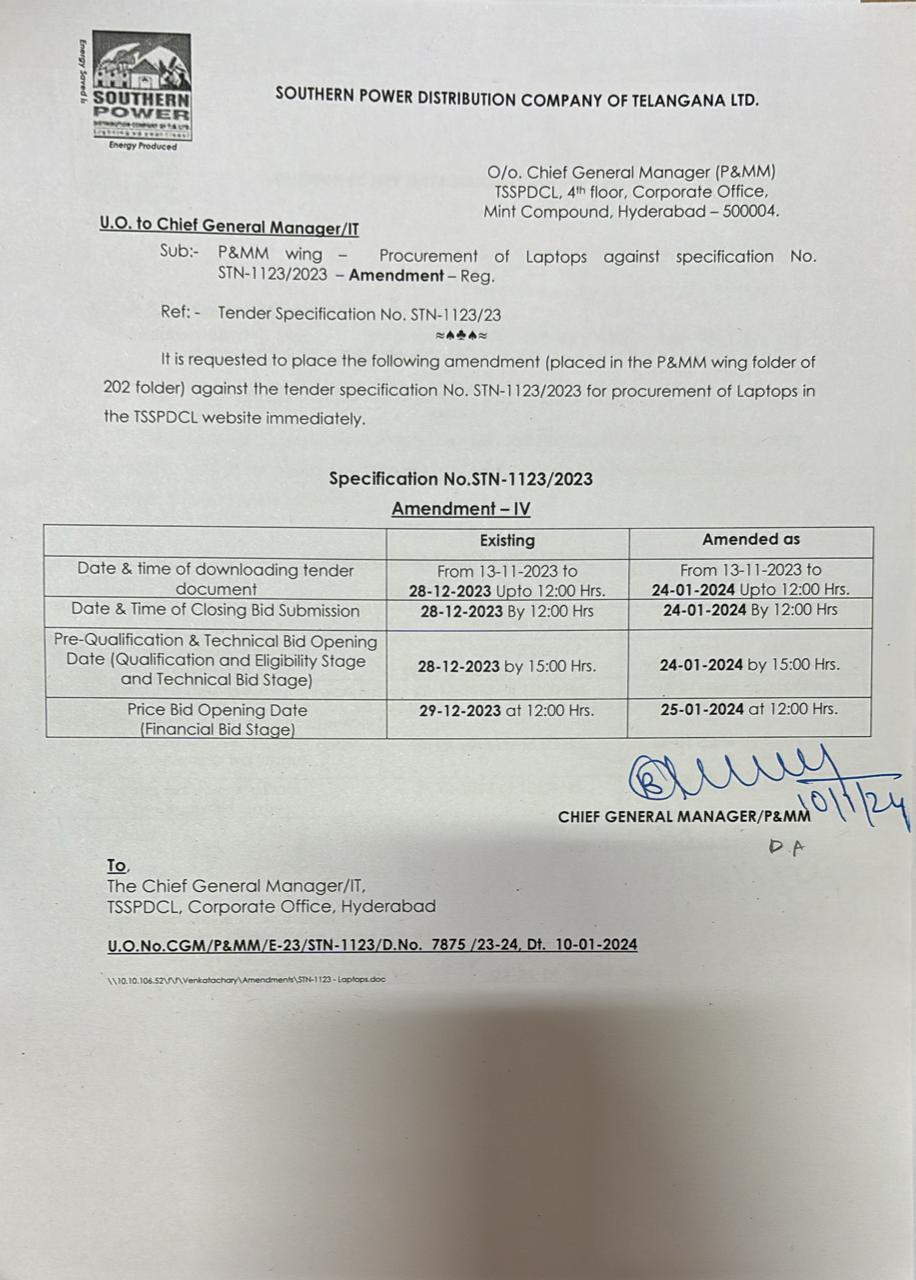 Amendment ? II TENDER SPECIFICATION STN-1041/2023 CHIEF GENERAL MANAGER (P&MM) TSSPDCL